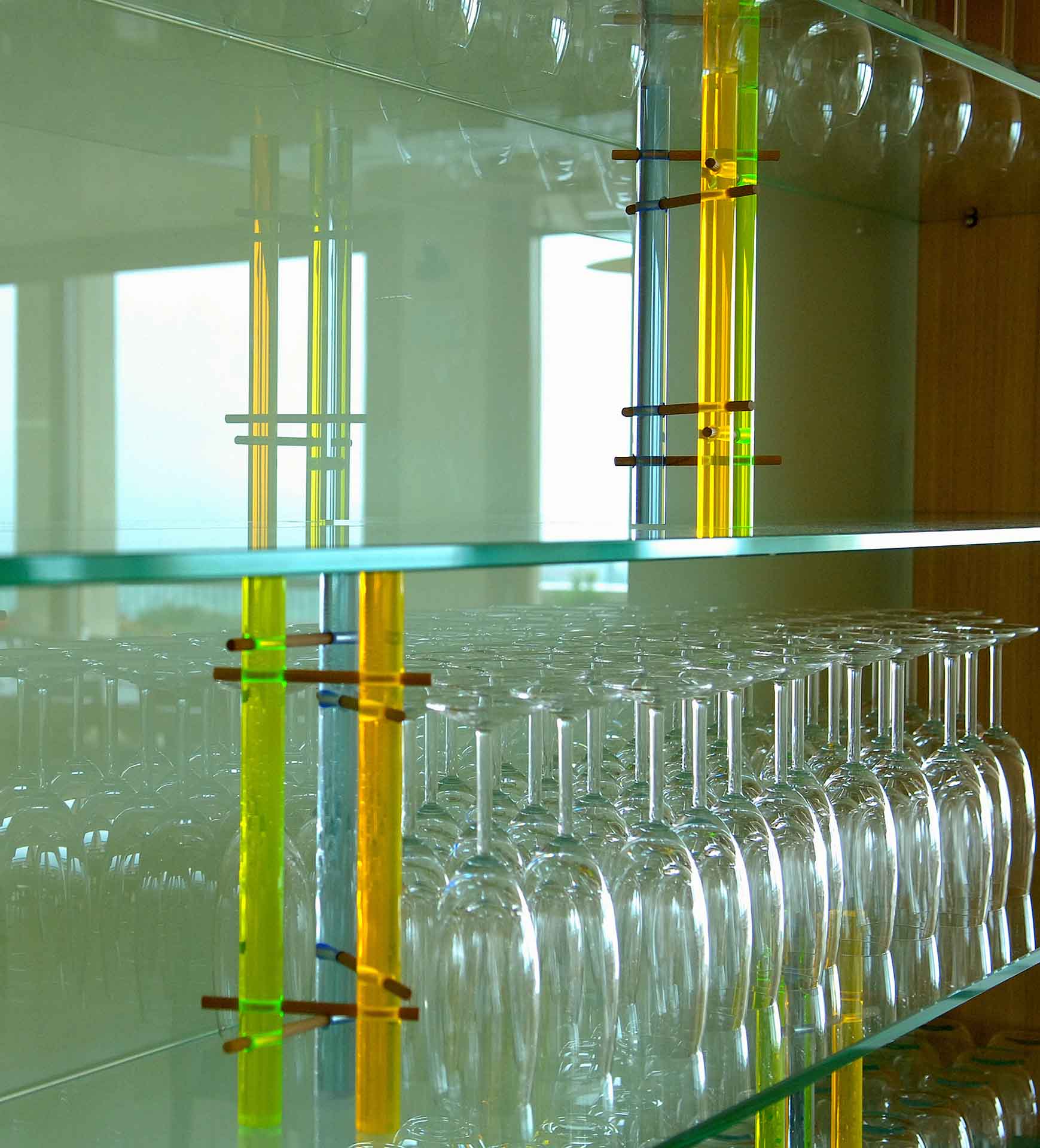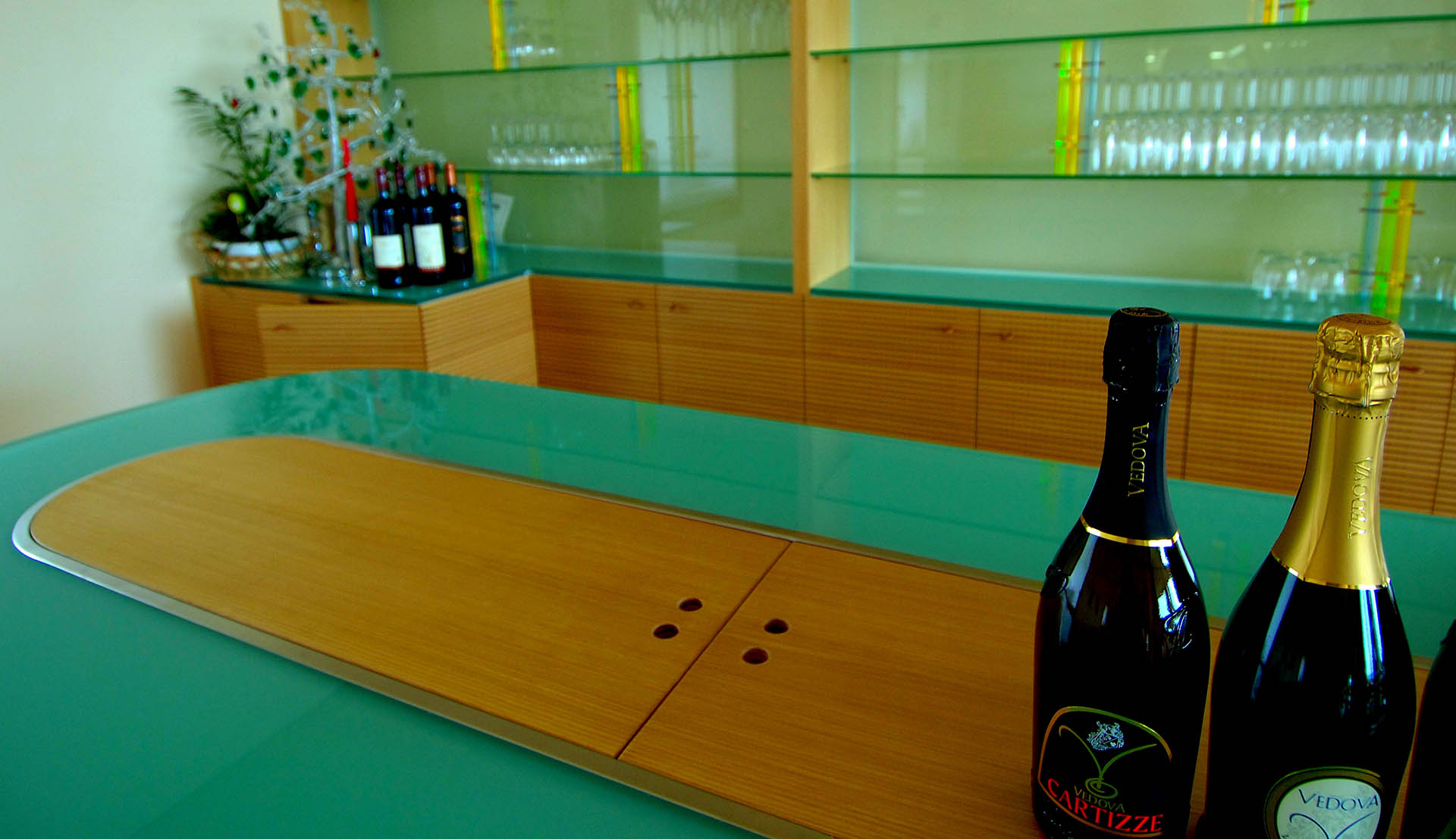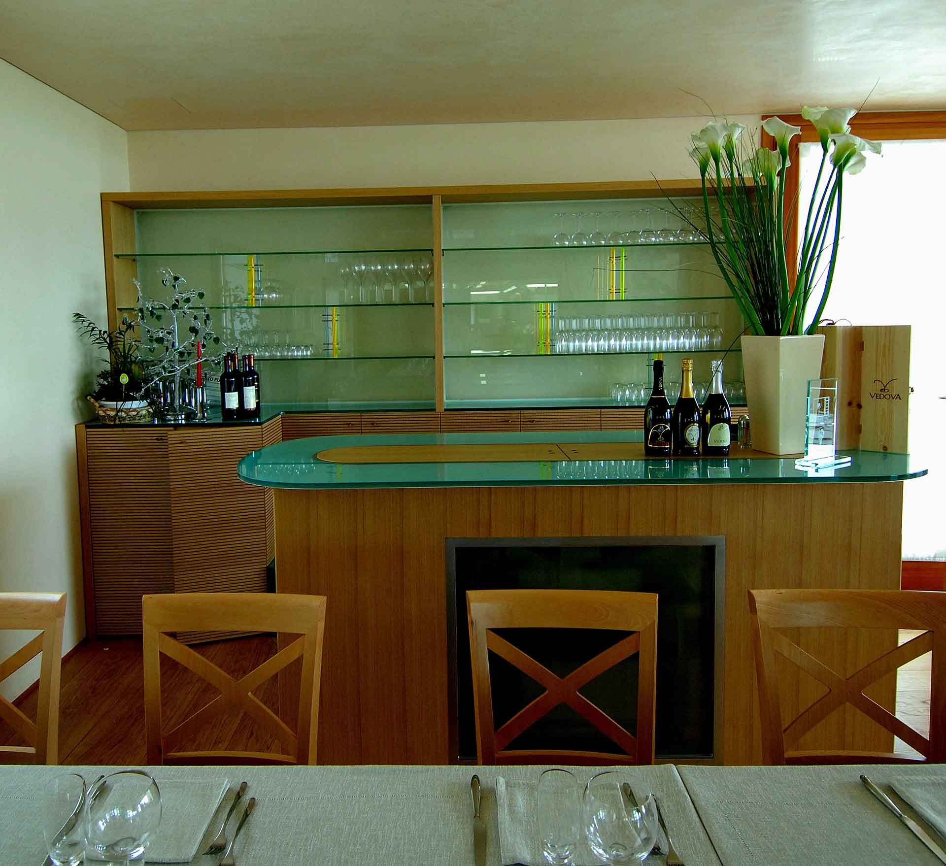 Arredo spazi comuni con strutture espositive: banco degustazione e bottigliera
