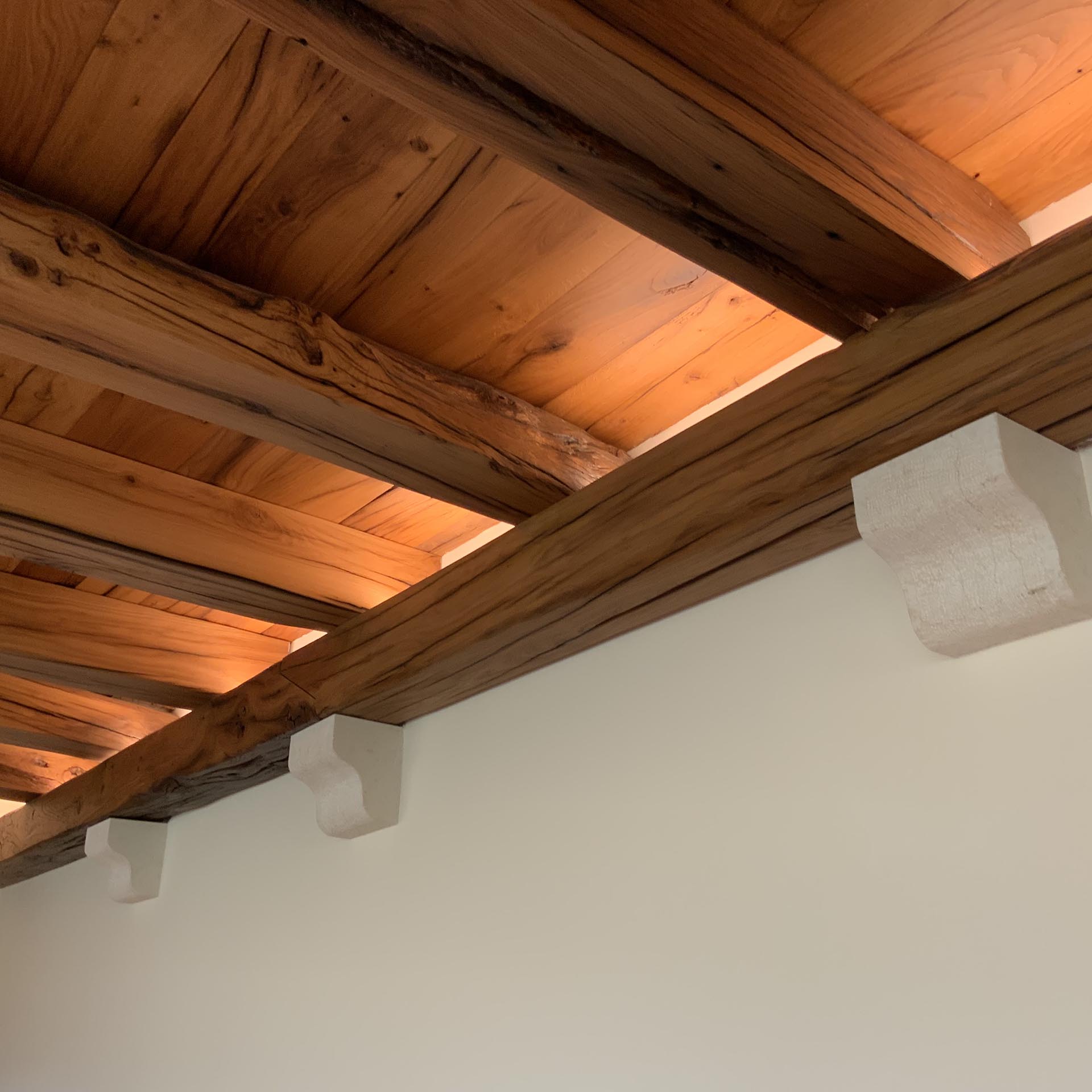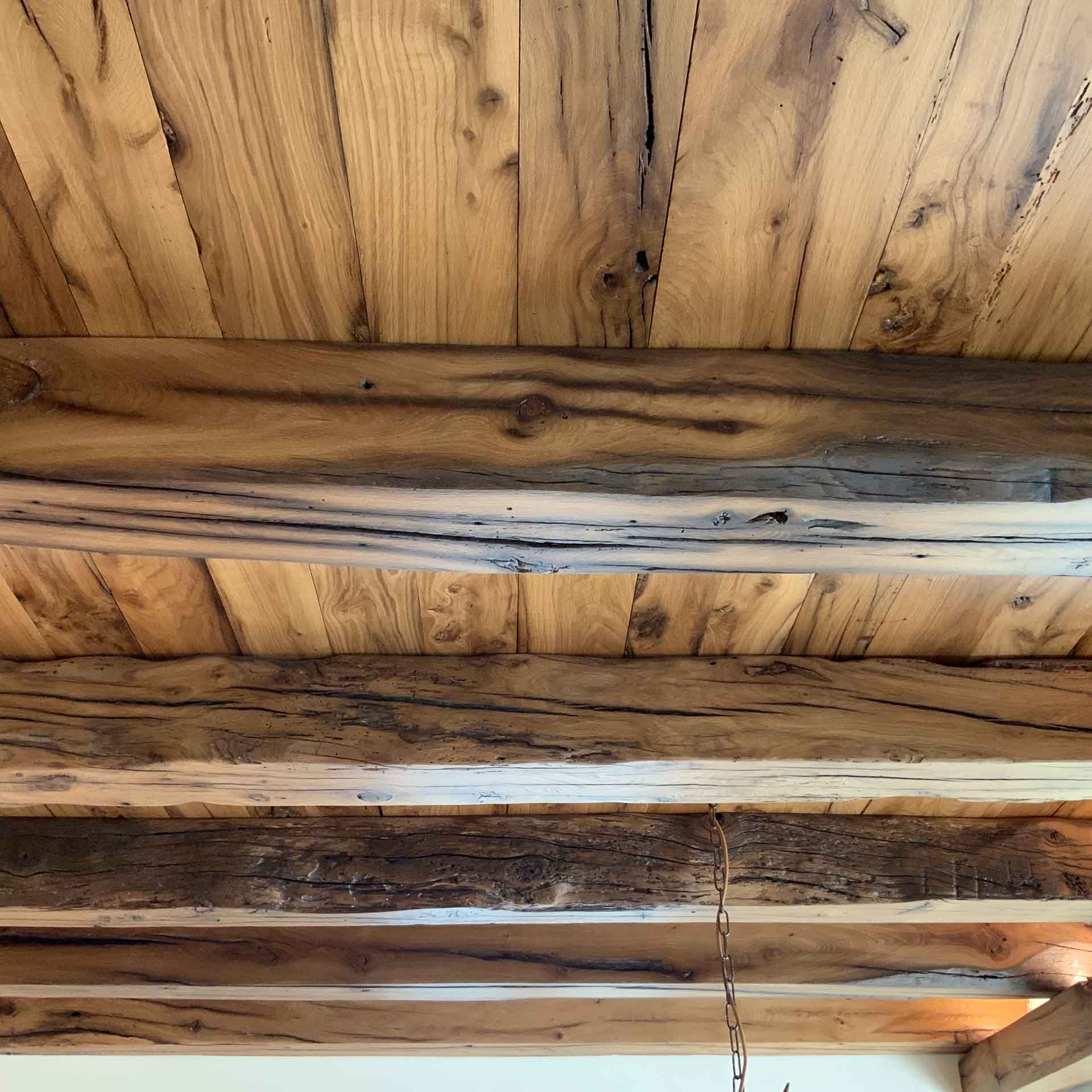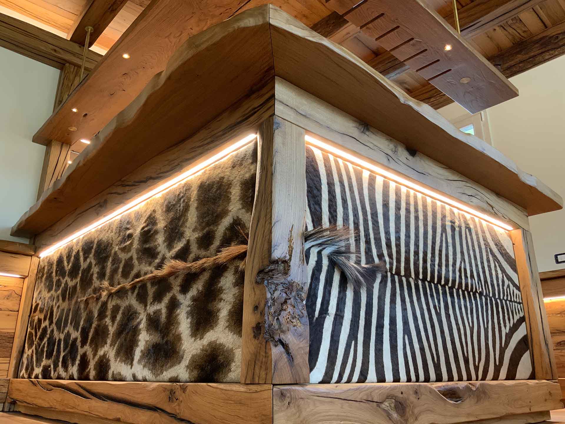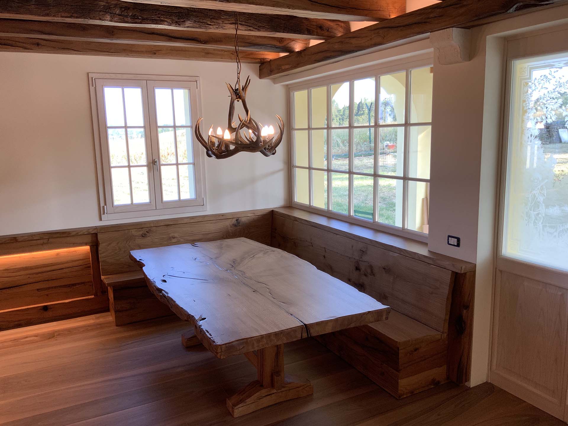 Il progetto di interior design dell’architetto Gian Paolo Mar ha previsto l’utilizzo del massello di rovere antico per tutti gli elementi di arredo. Dalle travi del soffitto al bancone passando per il tavolo, le panche e i rivestimenti. Le grandi tavole di rovere vengono lasciate il più possibile nella loro forma originale sia nell’aspetto che nella finitura donando al progetto un’eleganza unica unita ad una percettibile solidità in un’atmosfera calda ed accogliente.