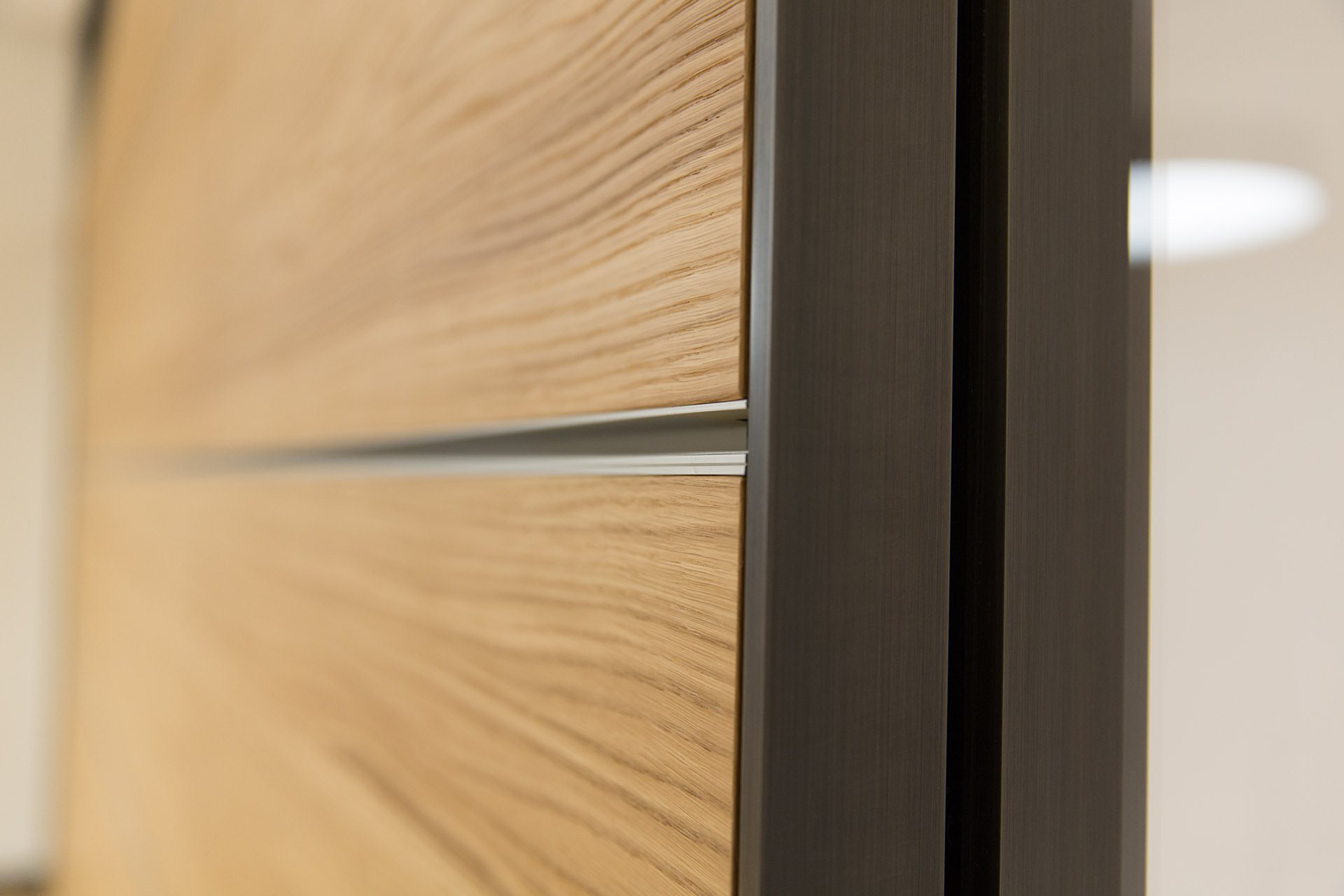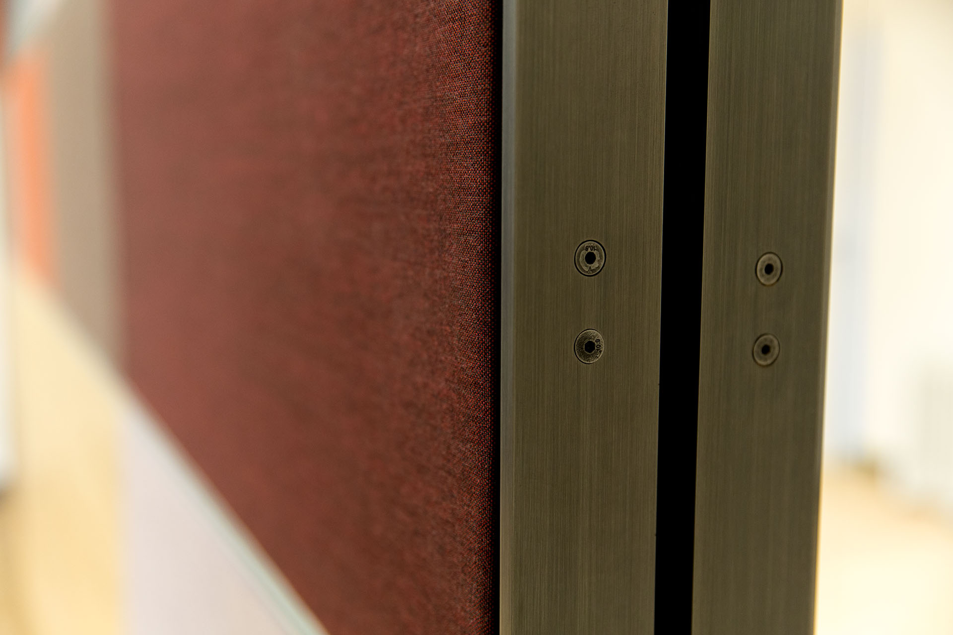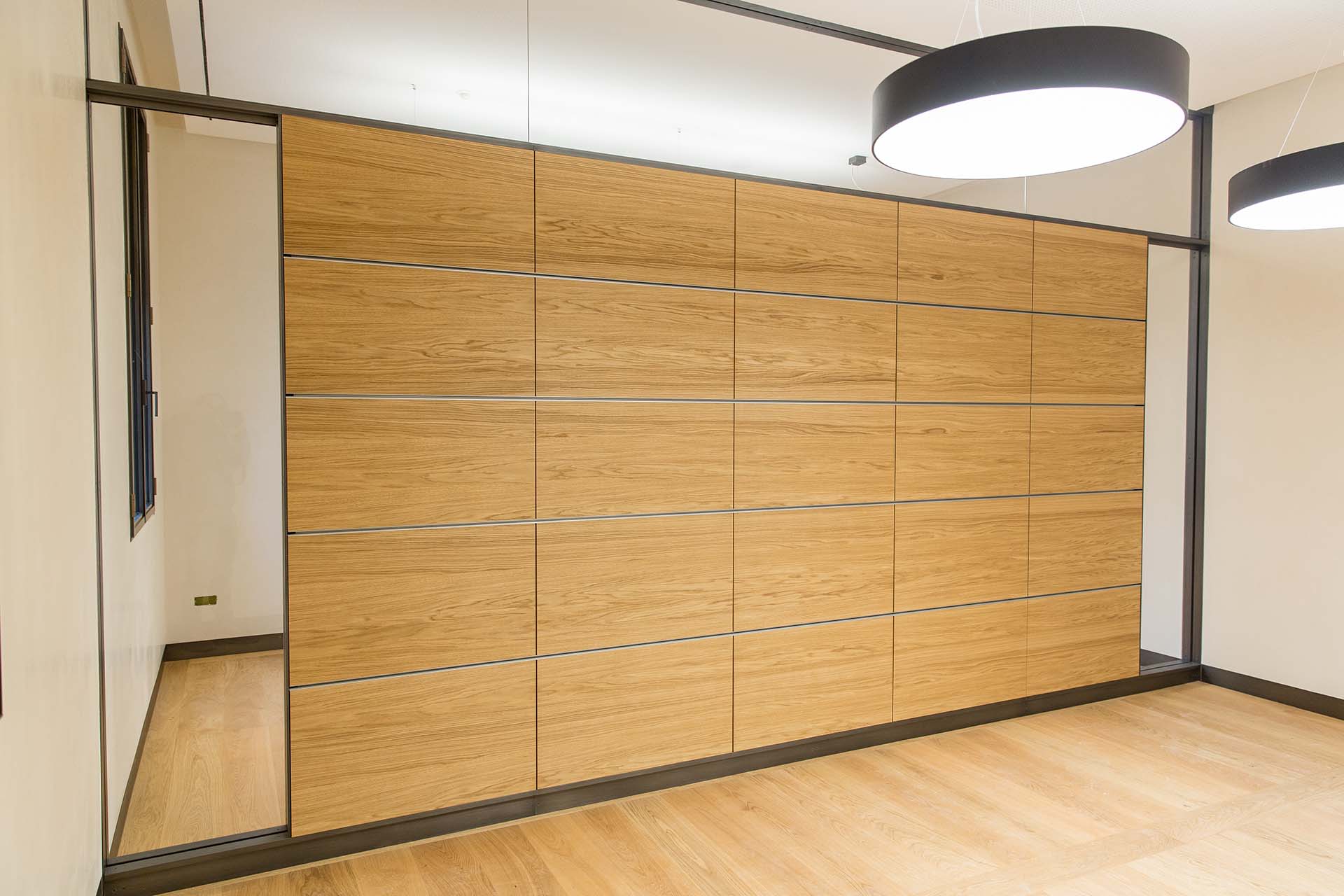 Studio e realizzazione mock-up di rivestimento a volta dei corridoi e pareti divisorie acustiche in legno, vetro e rivestimenti di tessuto