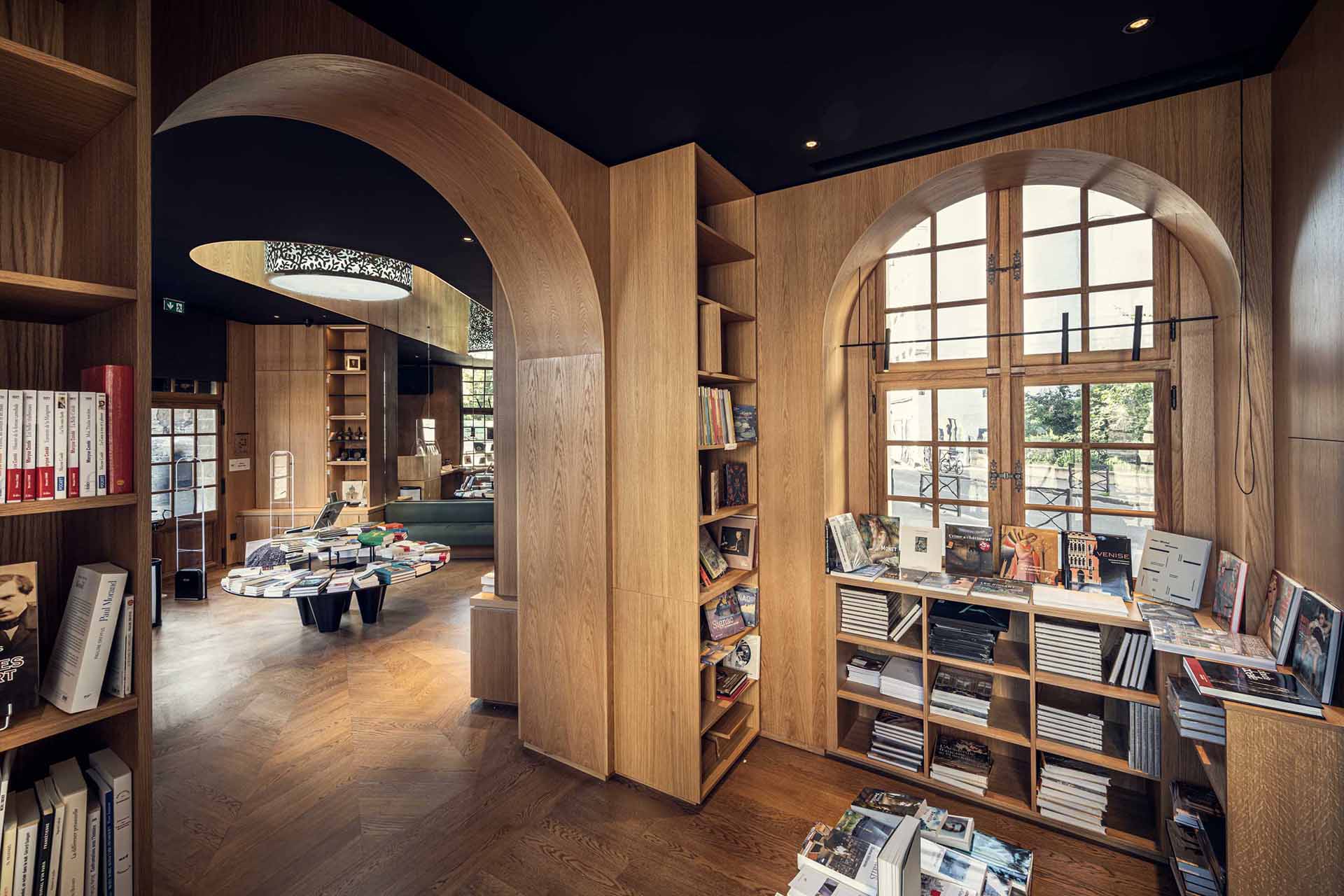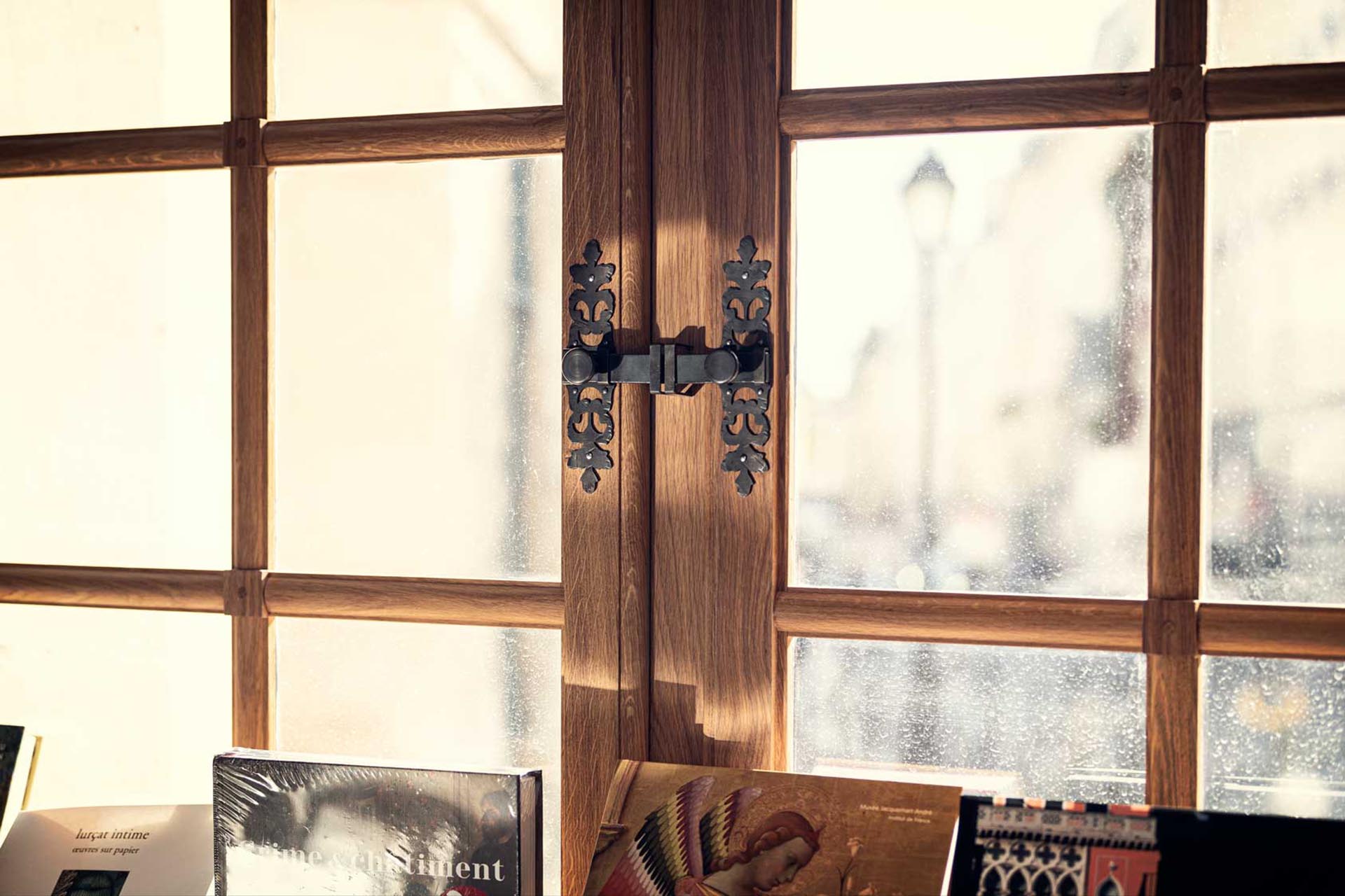 The creation of the bookstore is also part of a more comprehensive restoration project for the facades on the rue de Seine and rue Mazarine side. For this project, in addition to the renovation of the passage Le Vau, we will take care of the creation of new French windows in the spirit of the 17th century on the forecourt of the Institute and on the rue de Seine. The works consist in the realization of oak wood aged in air 11 years, having the historical aspect while respecting the functional characteristics of our time. The accessories as well, as the hinges, handles and locks have been recreated following the same criteria.