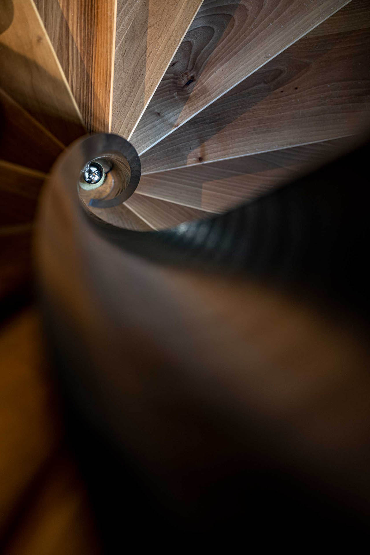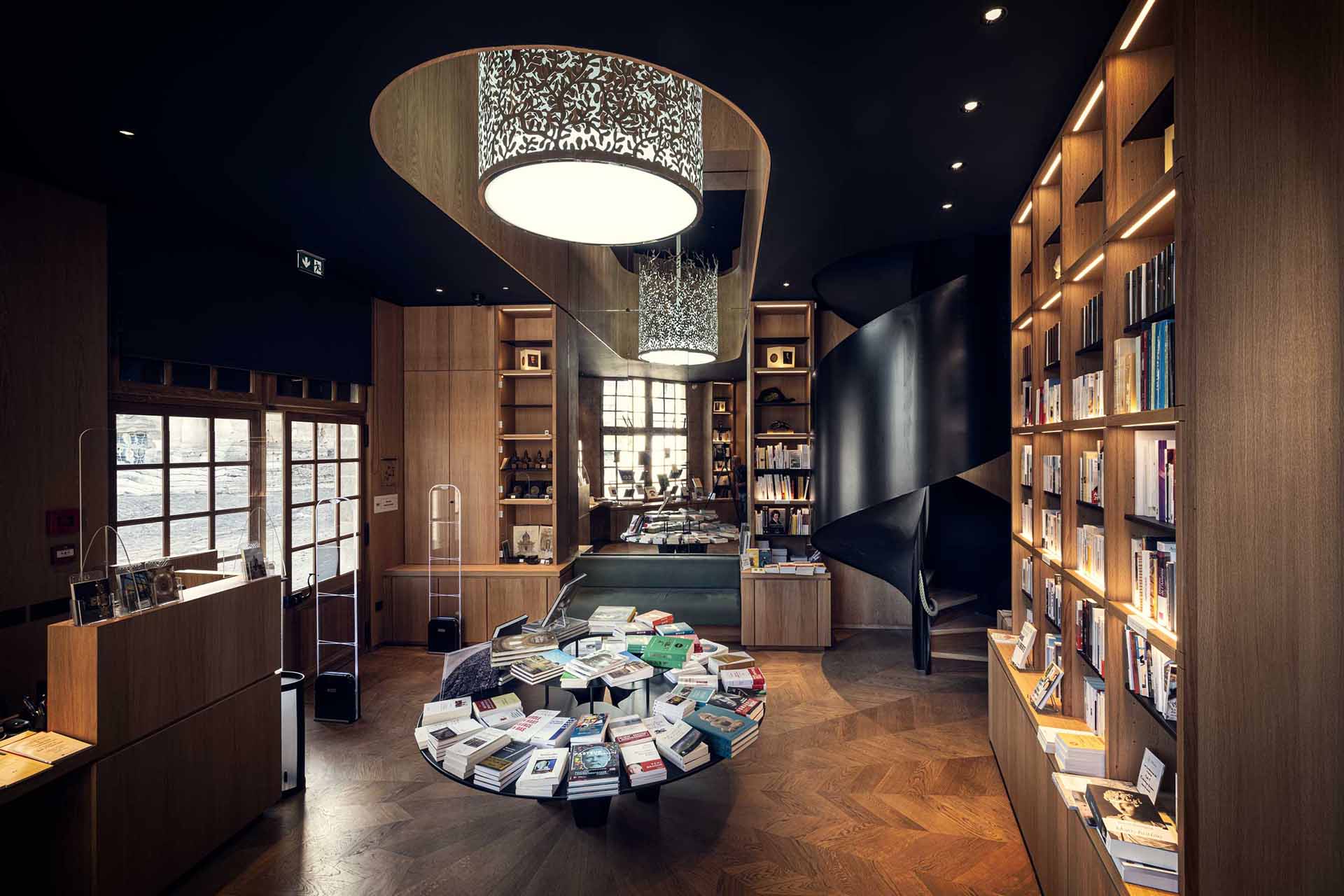 For the creation of a new helical staircase with a steel structure and its railing within the bookstore, the supporting iron structure was covered with placo, then painted in a semi-gloss black color, just like the steps which have been covered with walnut wood.