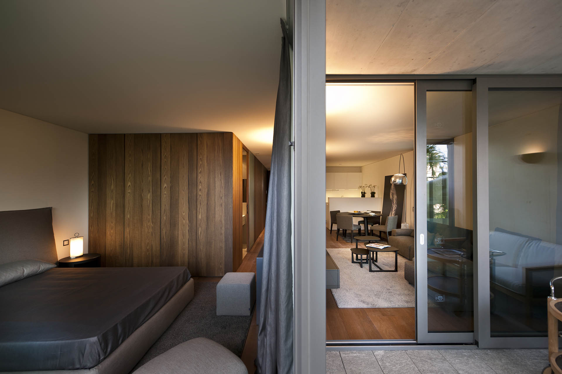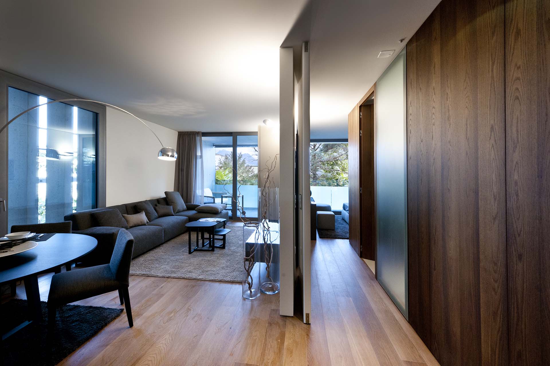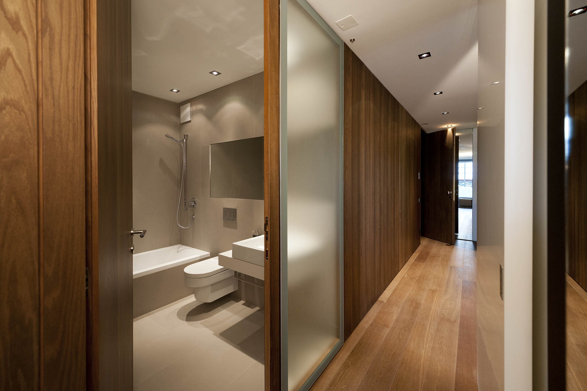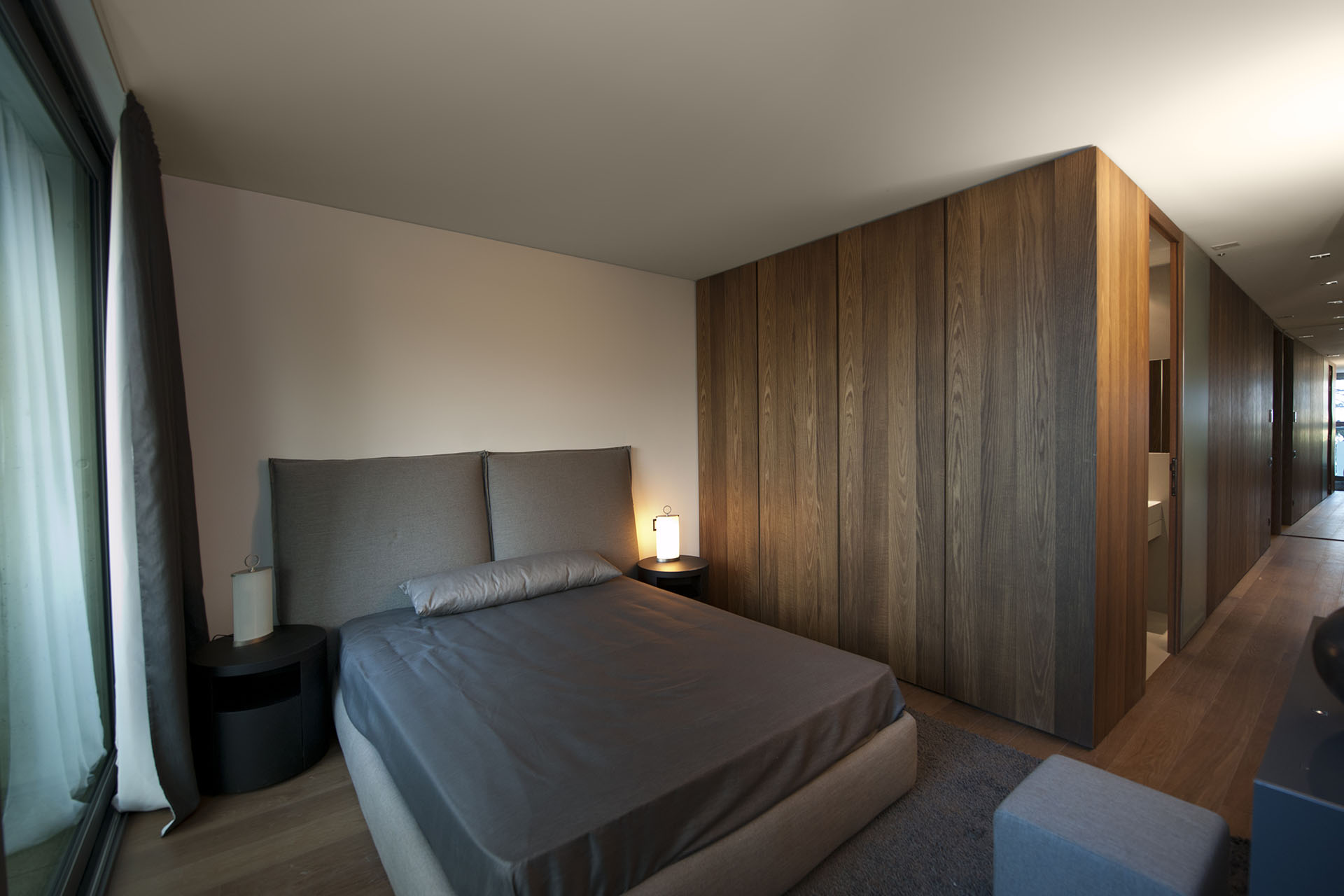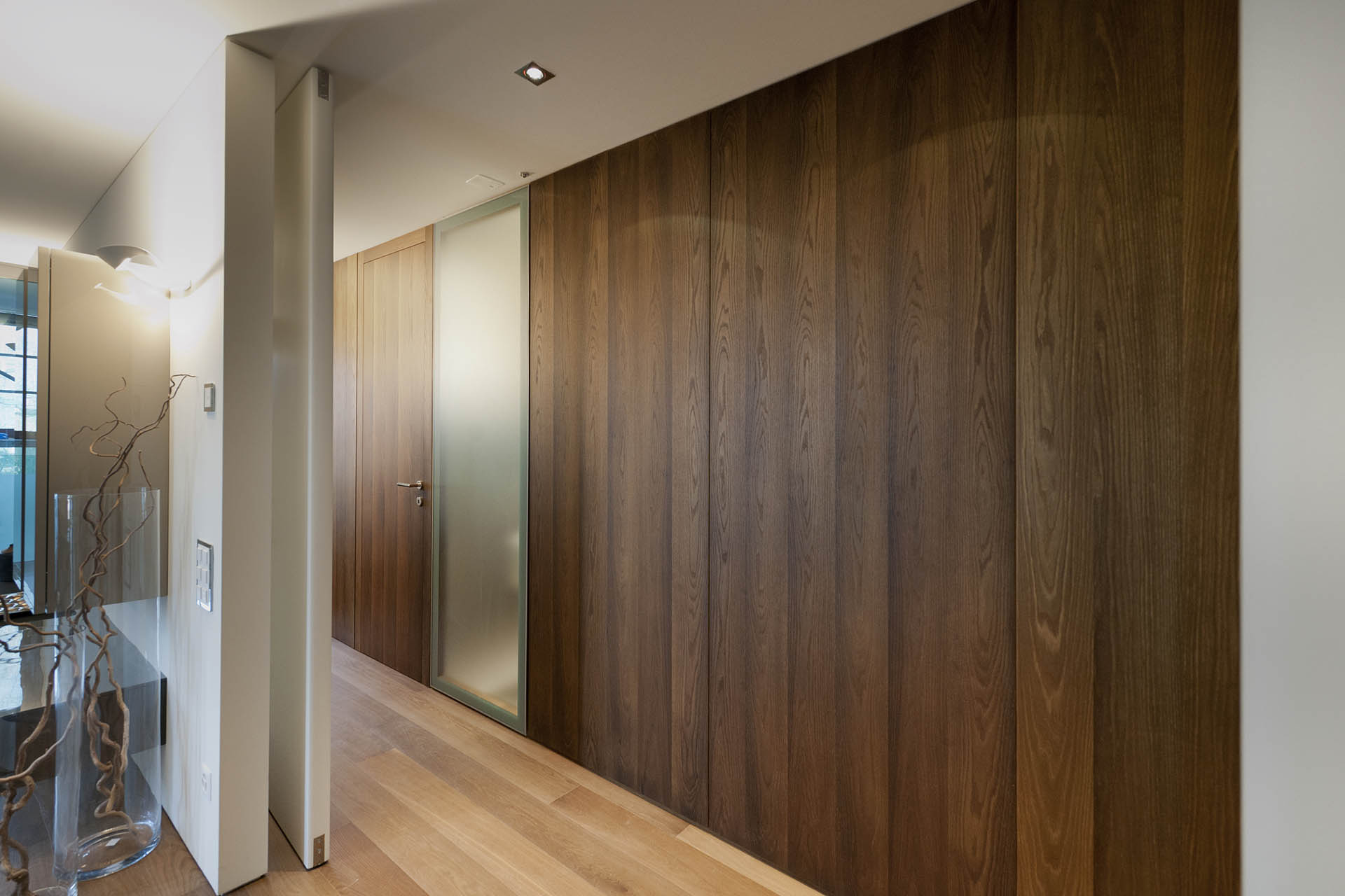 Realization of furniture for sample apartment: doors, panelling, cabinets in cotto oak