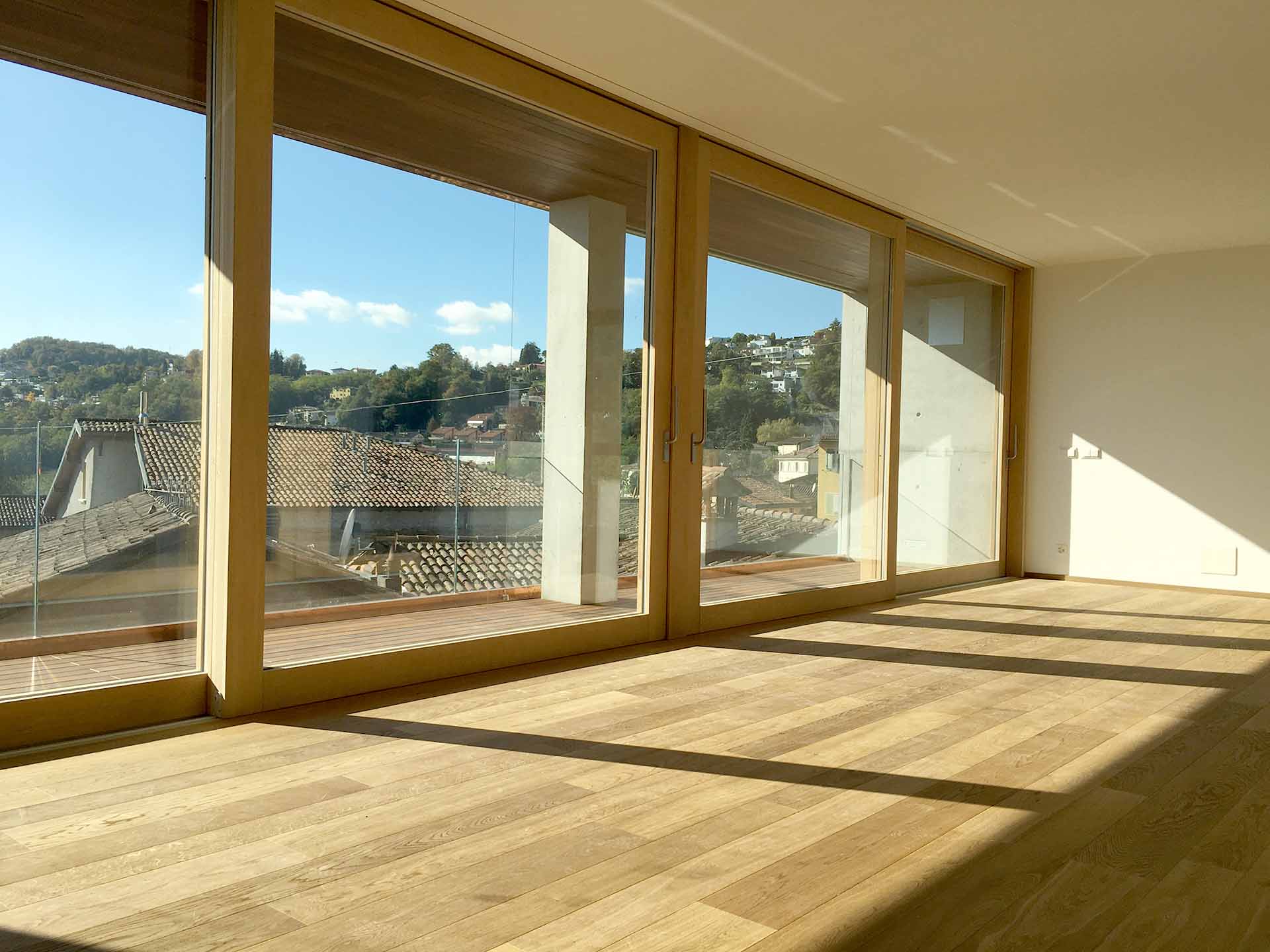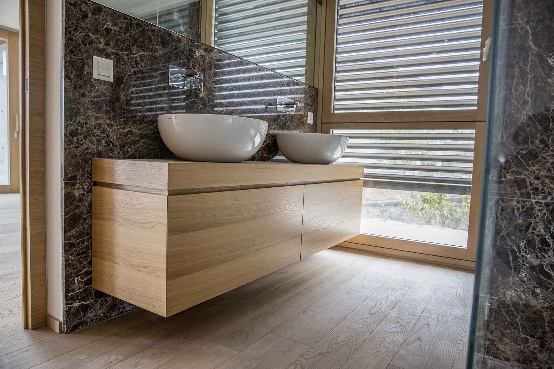 Design and realization of motorized covering systems in aluminium profiles covered with oak wood. Supply of interior and exterior glass and marble cladding. Furniture for private apartments, bookcases, kitchens, wardrobes